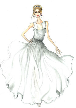Trabajo la luz a través del brillo de las telas, la volatilidad con la caída vaporosa y ruedos de los vestidos, la levedad con la caía etérea de las telas por su excelente calidad o por la presencia de algo volador, la transparencia con telas que generan este efecto y también con bordados. Lo natural a través de flores, hojas y pasamanerías que he encontrado recorriendo diferentes mercerías de Barcelona.